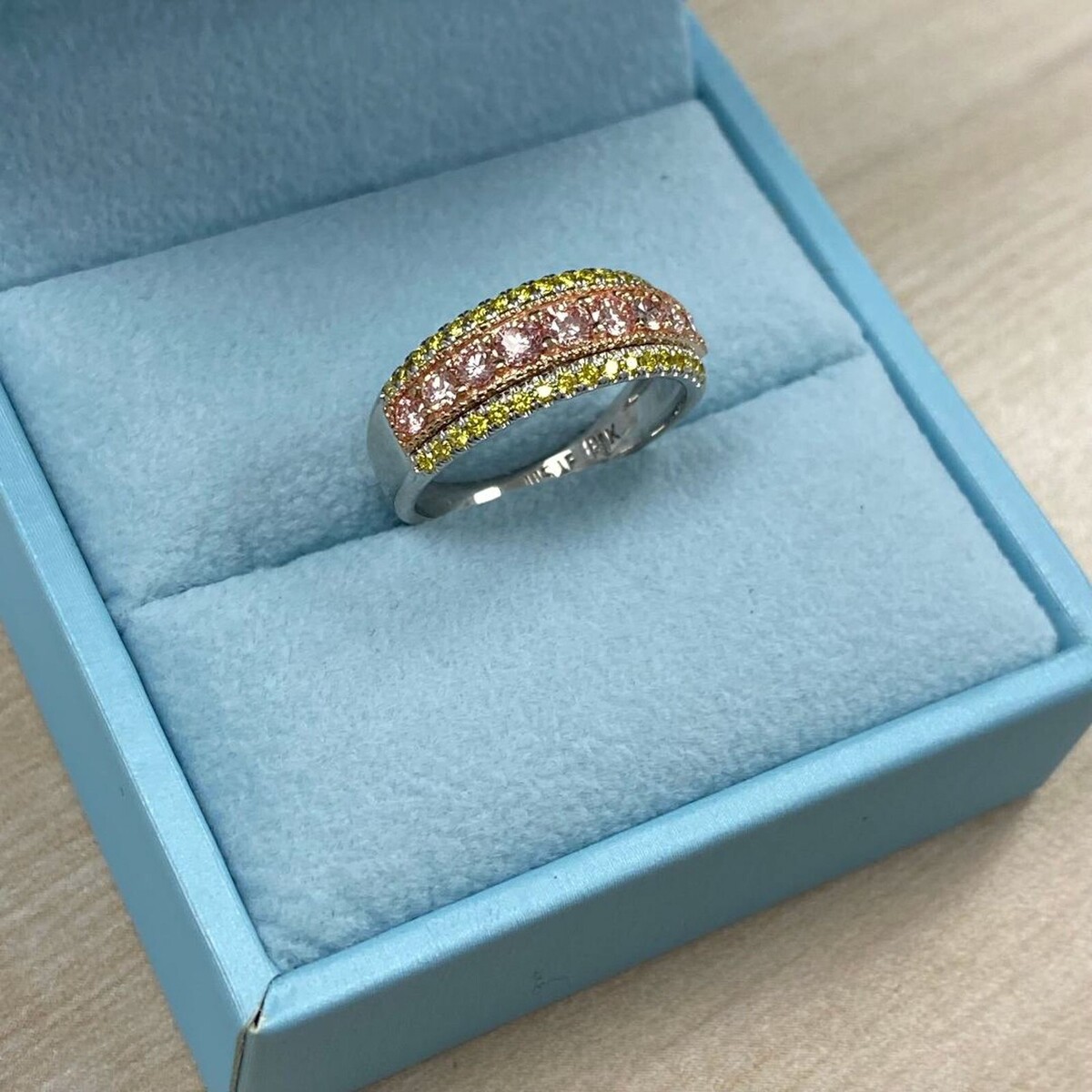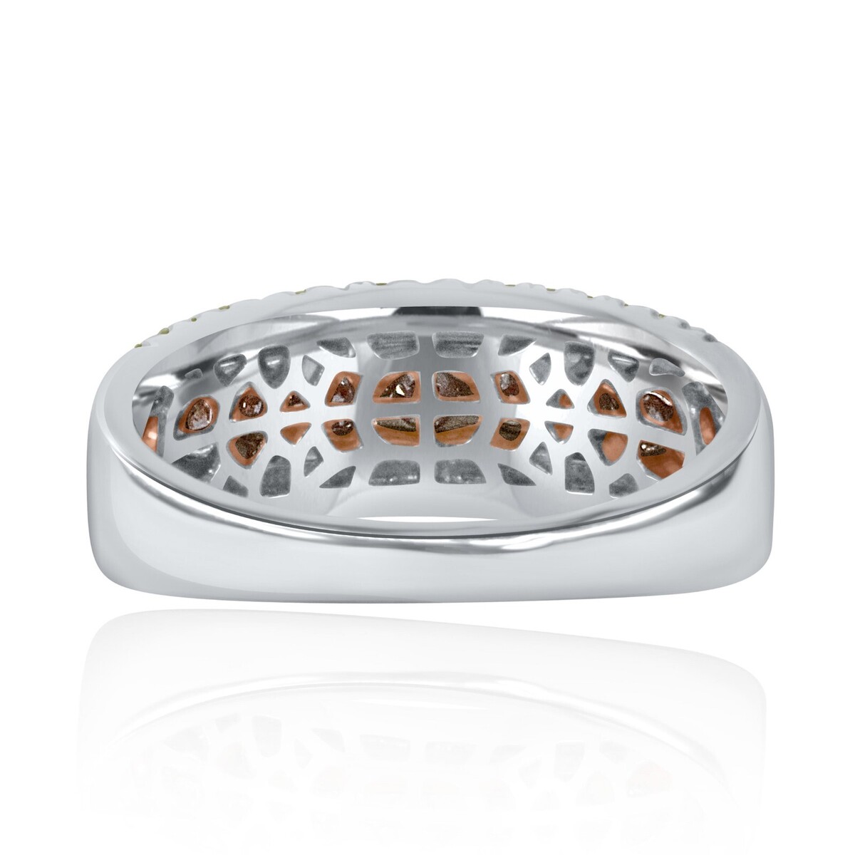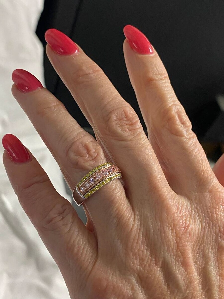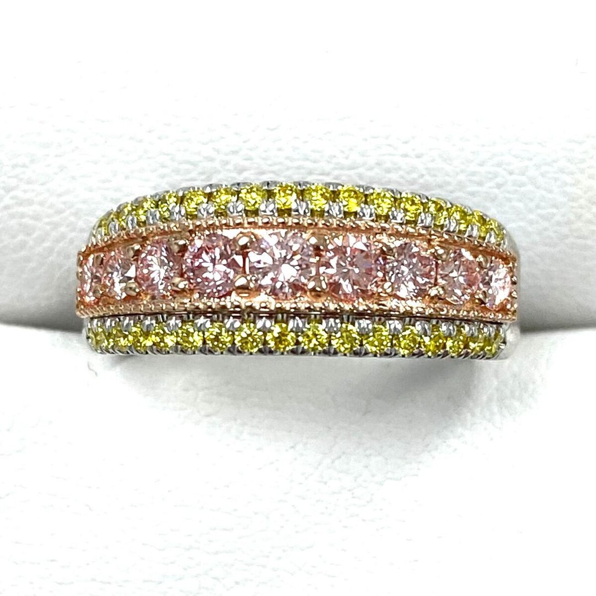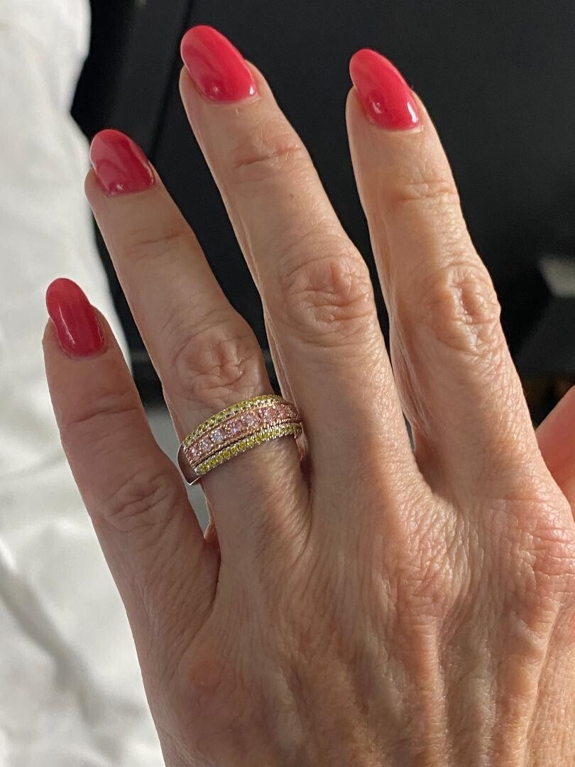 Cette etonnante alliance unique en son genre comprend un diamant rose rond taille brillant de 0,59 carat serti dans de l'or rose blanc 14 carats, avec des diamants jaunes ronds taille brillant supplementaires de 0,41 carat. Cette combinaison de pierres precieuses et de metaux peut creer un beau contraste et creer un look unique et elegant !! Le poids total en carats est de 1,00 carats.