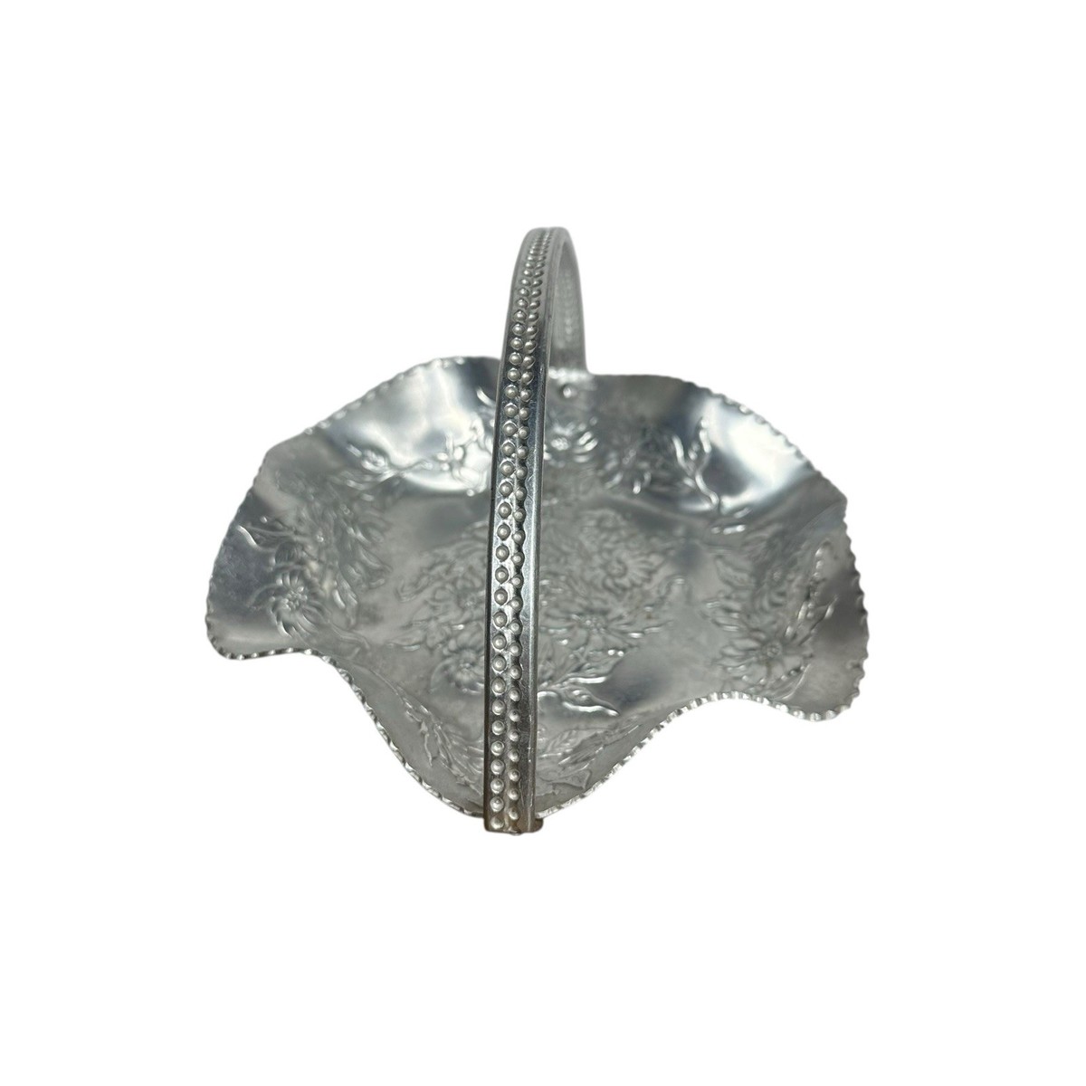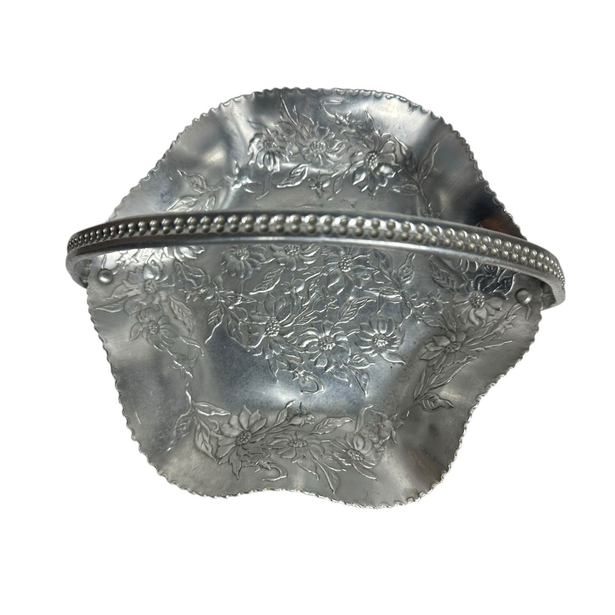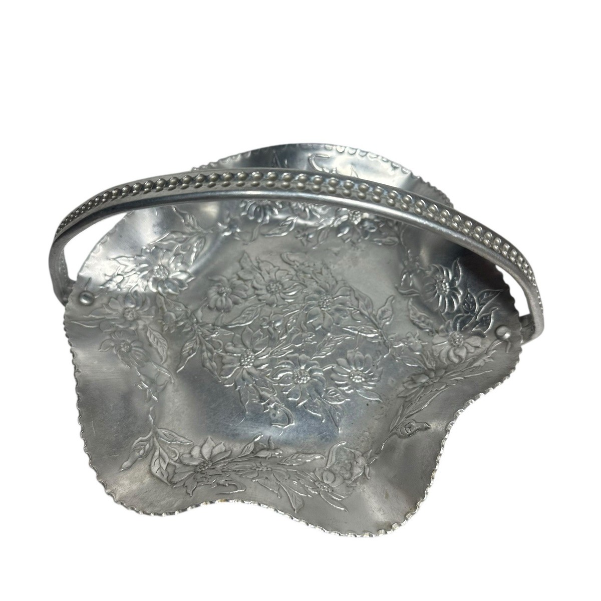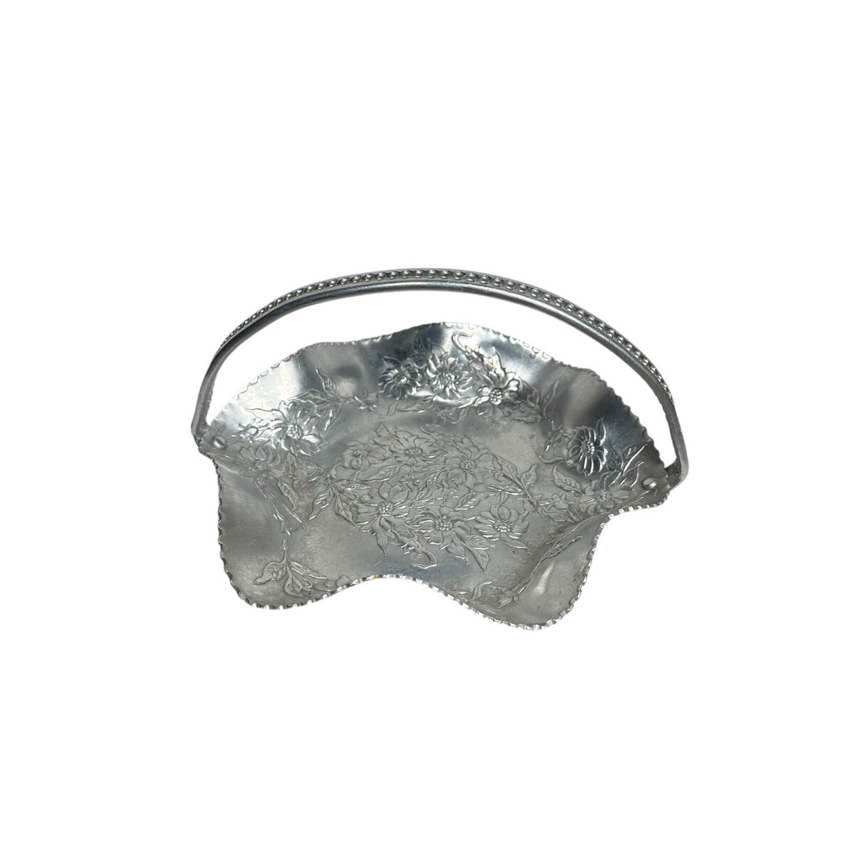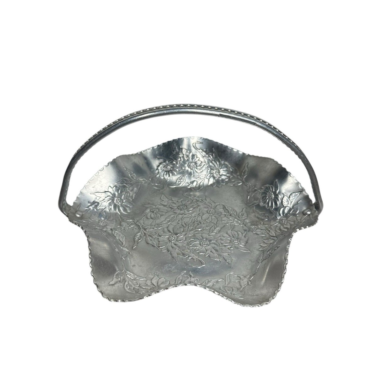 Vintage Hand Wrought Hammered Aluminum Floral Basket Serving Dish 4" T x 7.5" W