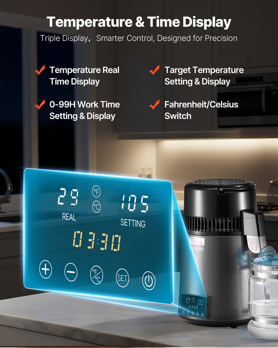 Efficient Distillation: The 750W water distiller operates at a speed exceeding 0.3GAL/1L per hour, capable of eliminating most impurities from tap water. The water distiller can distill a total of 7.2GAL/24L each day