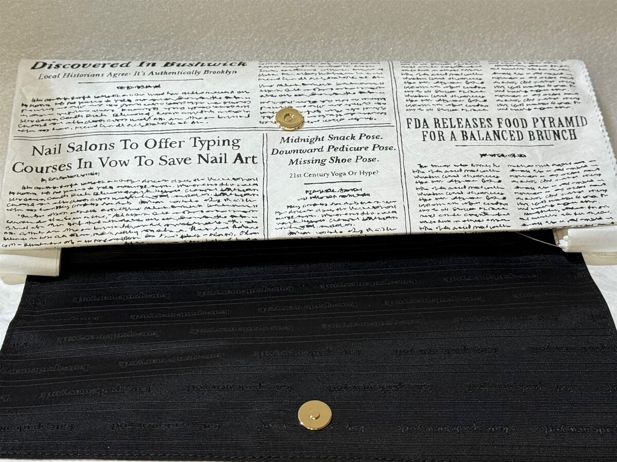 From the Glitzy Ritzy Collection. This whimsical newspaper clutch pairs perfectly with your morning coffee.