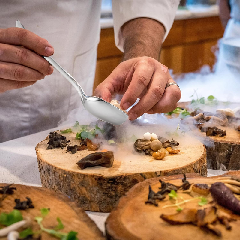 Multiple Applications: these wide, deep spoons are good for stirring or collecting juices for basting, can be applied to appetizer dishes, curries, salads, party platters, buffets, fruit platters, tea, ice cream and more, which is proper for serving all sorts of dishes
