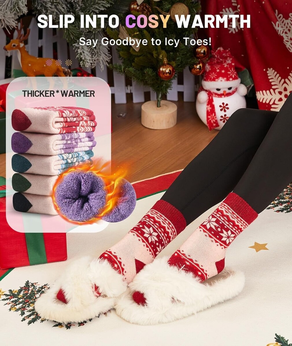 5 Pairs Women's Merino Wool Blend Thick Socks Fair Isle Print Winter Colors Gift