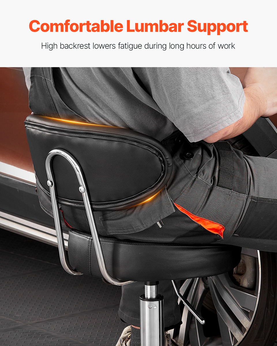 300 lbs Weight Capacity: Built with a heavy-duty carbon steel frame and reinforced screws, this garage stool supports up to 300 lbs and maintains its shape over long-term use. The stable center of gravity ensures it remains upright and helps avoid tipping.