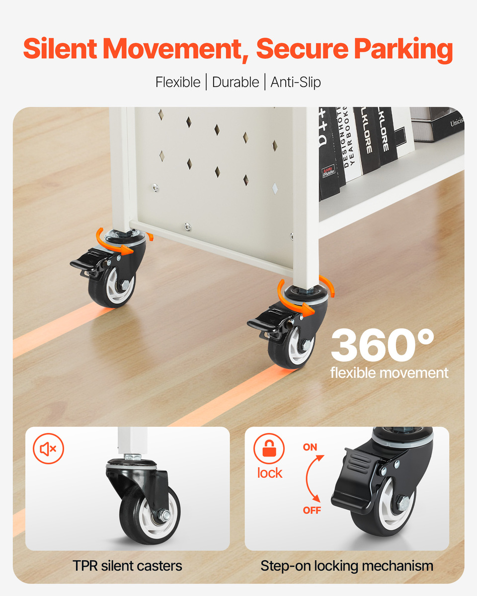Silent Movement: TPR silent swivel casters glide smoothly, and two have a locking feature for secure positioning. Move the book truck effortlessly across wood or tile floors without disturbing anyone—great for libraries or nighttime use