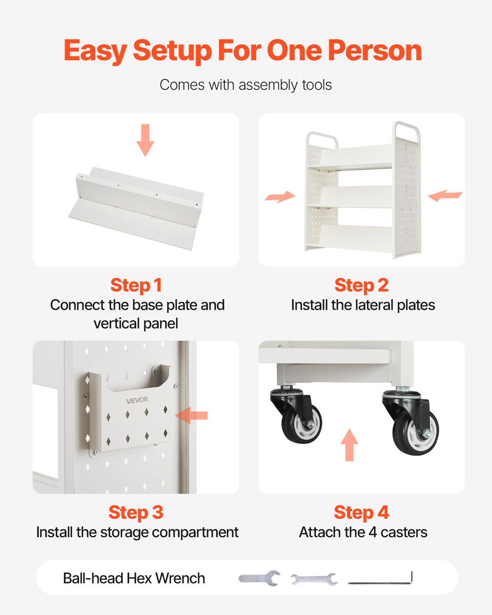 Quick Installation: No need for complex tools! The library book cart is easy to assemble with pre-drilled holes, so you’ll have it ready in no time. Includes an installation guide and extra screws for your convenience