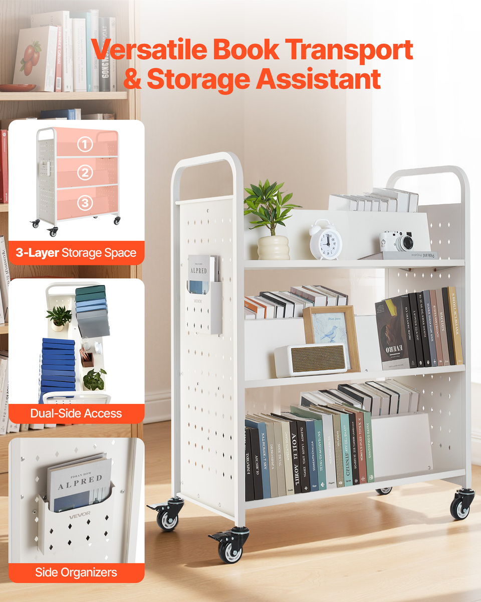 Extra Large Capacity: This 3-tier book cart with 14.14-inch high shelves holds a ton of books or office supplies! It’s also equipped with side compartments for A4 folders/tablets—ideal for libraries, home use, and more