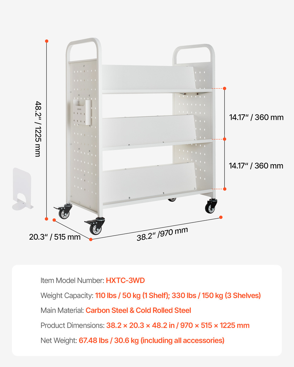 VEVOR Rolling Library Book Cart, 330 lbs Capacity, 38.2 x 20.3 x 48.2-In, White
