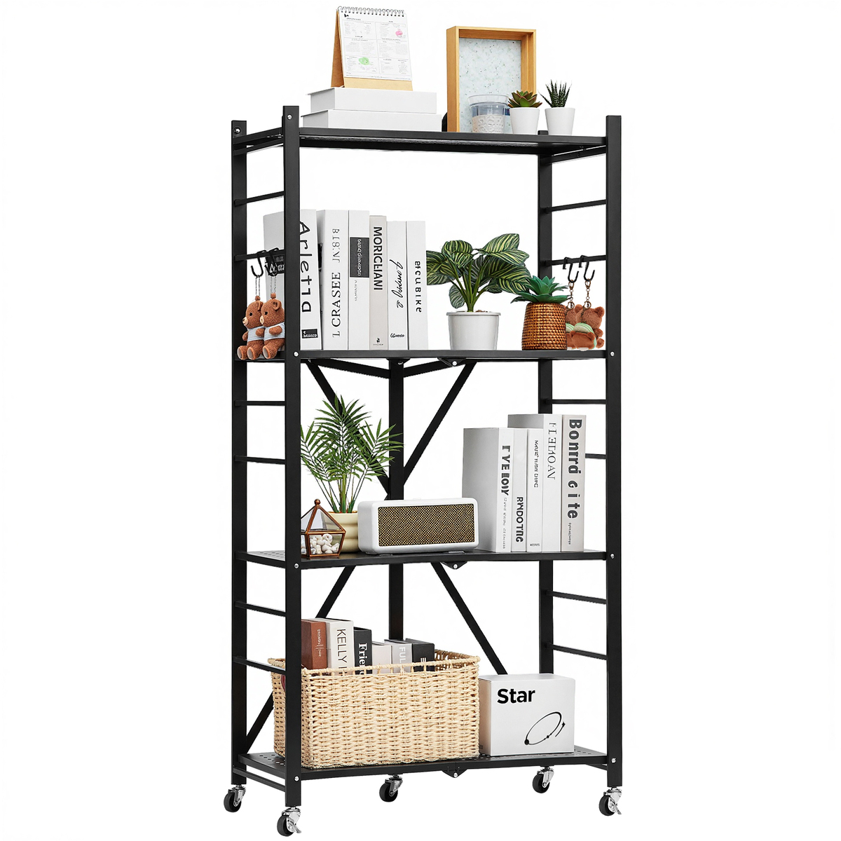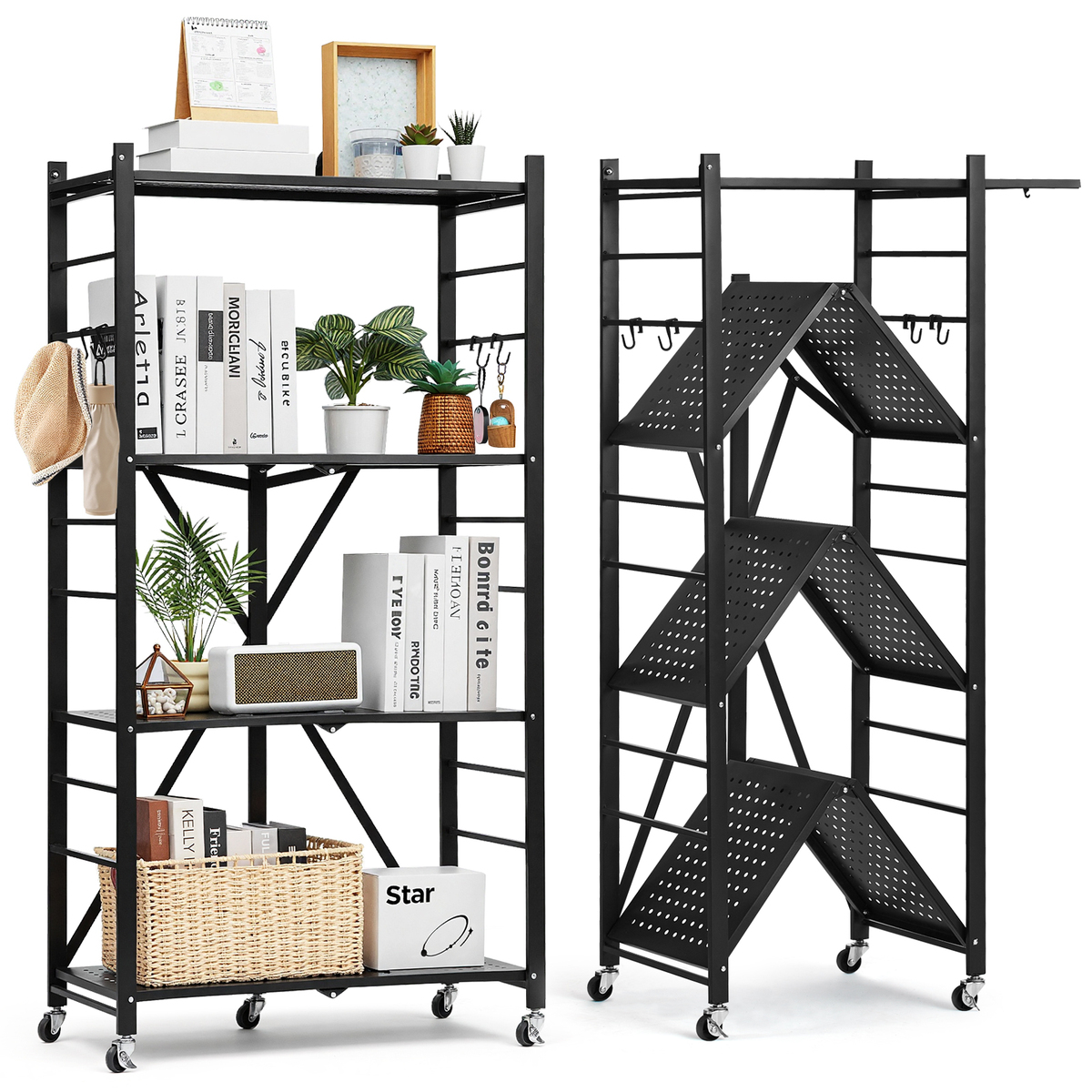 Versatile Use: Switch between support feet or caster modes, plus 4 J-hooks for hanging. Ideal for living rooms, kitchens, stores, exhibitions, or anywhere you need organized storage. Versatility at its best!