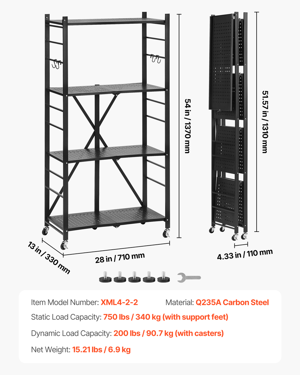 Sturdy and Secure: The Q235A carbon steel frame of the folding shelving unit holds up to 190 lbs per layer. Detachable support feet bring a static load capacity of 750 lbs. Plus, the crossbar keeps everything from slipping. Organize with ease!