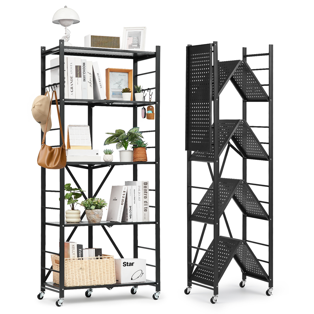 Versatile Use: Switch between support feet or caster modes, plus 4 J-hooks for hanging. Ideal for living rooms, kitchens, stores, exhibitions, or anywhere you need organized storage. Versatility at its best!