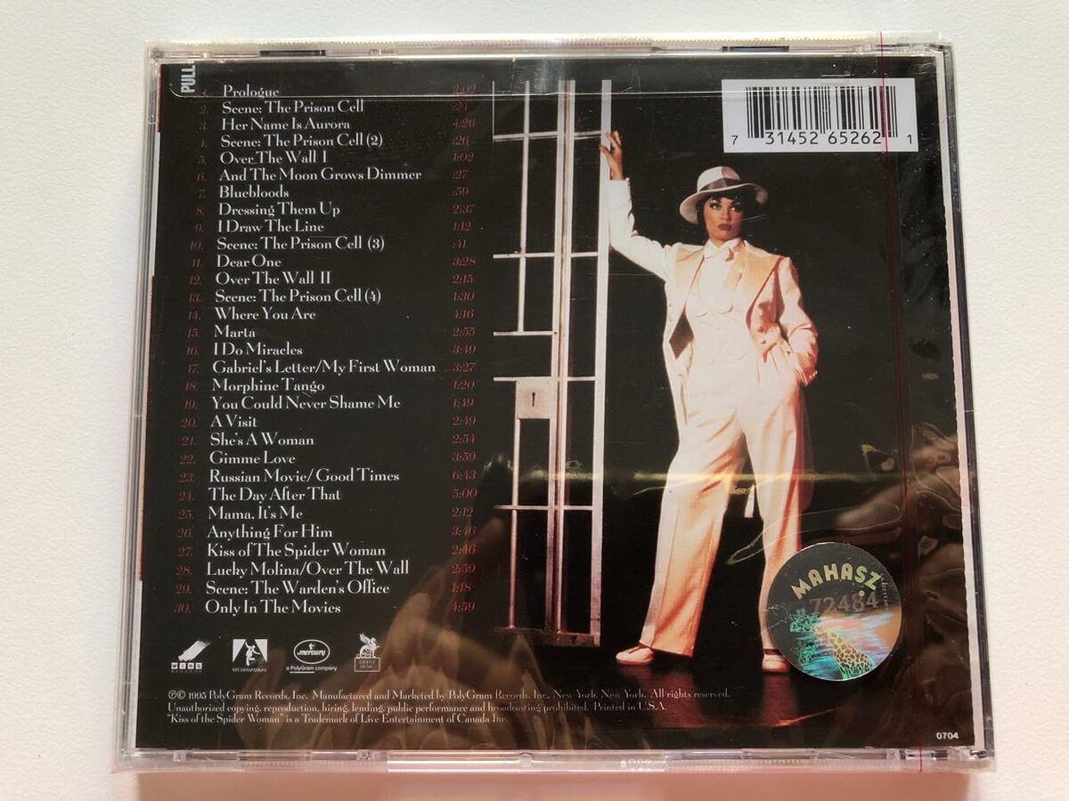 Product description: Kiss Of The Spider Woman: The Musical - New Broadway Cast Recording / Venessa Williams, Howard McGillin and Brian Mitchell / Produced For Records by Thomas Z. Shepard / Mercury Audio CD 1995 / 314 526 526-2 UPC 731452652621 /// Kiss of the Spider Woman is a musical with music by John Kander and Fred Ebb, with the book by Terrence McNally. It is based on the Manuel Puig novel El Beso de la Mujer Araรฑa. Directed by Harold Prince, the musical had runs in the West End (1992) and Broadway (1993) and won the 1993 Tony Award for Best Musical. // Label: Mercury ? 314 526 526-2 Format: CD, Album Country: US Released: 1995 Genre: Stage Screen Style: Musical //// Tracklist: 1 Fred Ebb, John Kander? Prologue 2 Fred Ebb, John Kander? Scene: The Prison Cell 3 Howard McGillin, Vanessa Williams? Aurora 4 Howard McGillin? Scene: The Prison Cell (2) 5 Fred Ebb, John Kander? Over The Wall I 6 Vanessa Williams? And The Moon Grows Dimmer 7 Brian Mitchell (2)? Bluebloods 8 Fred Ebb, John Kander? Dressing Them Up 9 Brian Mitchell (2)? I Draw The Line 10 Howard McGillin, Brian Mitchell (2)? Scene: The Prison Cell (3) 11 Howard McGillin, Brian Mitchell (2)? Dear One 12 Brian Mitchell (2), Howard McGillin? Over The Wall II 13 Vanessa Williams, Howard McGillin? Scene: The Prison Cell (4) 14 Fred Ebb, John Kander? Where You Are 15 Brian Mitchell (2)? Marta 16 Vanessa Williams, Howard McGillin, Brian Mitchell (2)? I Do Miracles 17 Howard McGillin? Gabriel's Letter / My First Woman 18 Fred Ebb, John Kander? The Morphine Tango 19 Howard McGillin, Mimi Turque? You Could Never Shame Me 20 Howard McGillin, Vanessa Williams? A Visit 21 Howard McGillin? She's A Woman 22 Brian Mitchell (2), Howard McGillin, Vanessa Williams? Gimme Love 23 Howard McGillin, Brian Mitchell (2), Vanessa Williams? Russian Movie / Good Times 24 Brian Mitchell (2)? The Day After That 25 Howard McGillin? Mama, It's Me 26 Howard McGillin, Brian Mitchell (2), Vanessa Williams? Anything For Him 27 Vanessa Williams? Kiss Of The Spider Woman 28 Fred Ebb, John Kander, Mimi Turque, Howard McGillin? Lucky Molina / Over The Wall 29 Howard McGillin, Brian Mitchell (2)? Scene: The Warden's Office 30 Howard McGillin? Only In The Movies Conductor ? Gregory J. Dlugos Directed By ? Harold Prince Lyrics By ? Fred Ebb Music By ? John Kander Orchestrated By ? Michael Gibson Vocals ? Brian Mitchell (2), Howard McGillin, Vanessa Williams