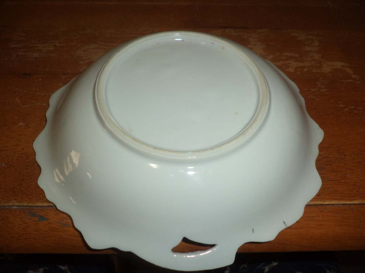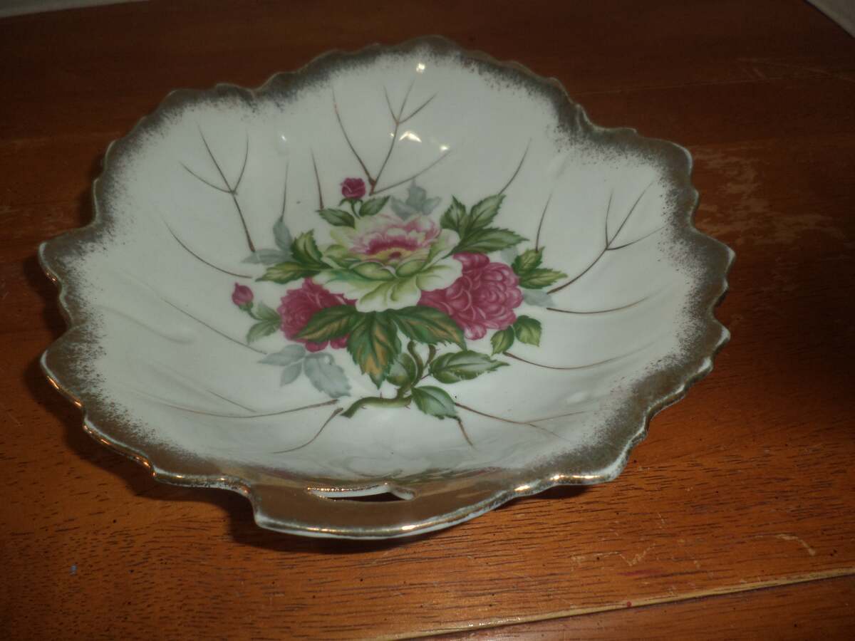 gold trimmed bowl with handle cut out, measures 8 1/2" wide x 1 1/2" tall