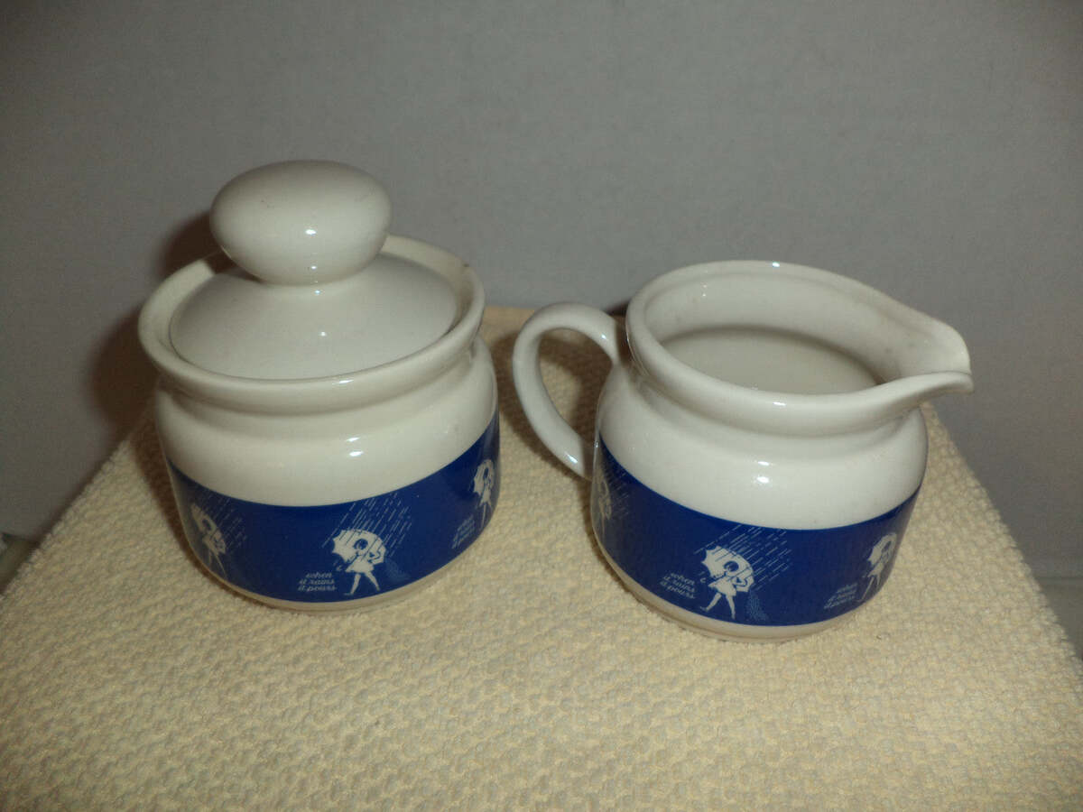 Four mugs and cream and sugar set, never used only displayed " When it rains it pours", best known girls 1968, 1914-1968-1956-1921.