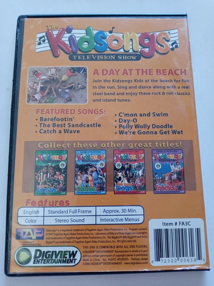 KIDSONGS - A Day at the Beach DVD. Condition is "Very Good". Shipped with USPS First Class.Very Good Condition ; Condition is Used-See Pictures Attached For Exact Condition . Shipped with USPS First Class Mail . You Will Receive 1 ea DVD as shown in pictures attached. RARE VINTAGE COLLECTIBLE SHIPS N 24 HOURS Packed By Our Award Winning Packaging And Shipping Department Long Time E-commerce Seller For Over 20 Years LIMITED AVAILABILITY THANK YOU FOR SUPPORTING OUR FAMILY OWNED USA BUSINESS Collectible Very Good Condition DVD ( DVD And Case Has Wear See Pictures Attached For Exact Description) - DVD's Are Tested And Cleaned With Our Professional DVD Cleaning Equipment Before Shipped - Ships Immediately - Great Product at a Unbelievable Price - Your Chance To Own This Collectible DVD Before Its Gone. Inventory Box #6199