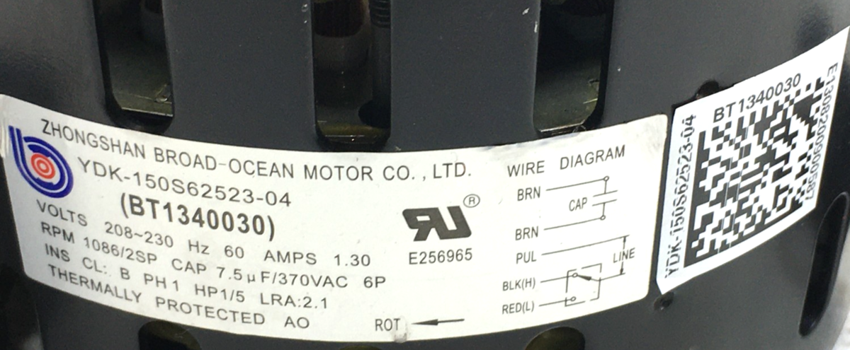 This is Zhongshan Broad-Ocean YDK-150S62523-04 Blower Motor BT1340030 208/230V 1/5HP 1086RPM/2SP used part.
