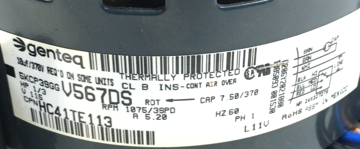 This is GE Motors 5KCP39GGV567DS Blower Motor 1/3HP 1075RPM 3SPD 115V HC41TE113 used part.