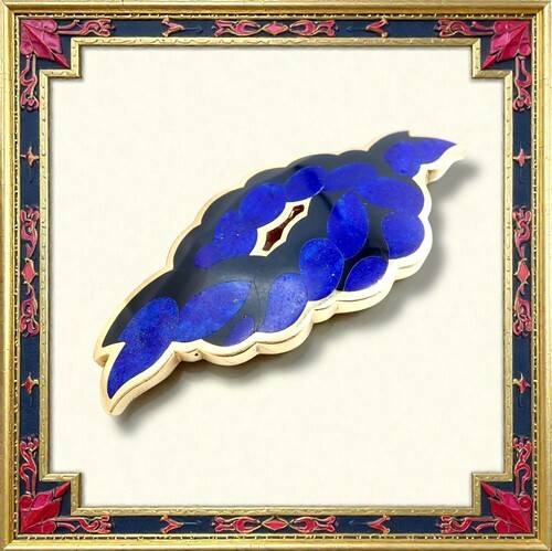 Rare Tiffany Co. Cummings brooch crafted in 18k yellow gold, showcasing an intricate nautical rope-knot motif in vibrant lapis and sleek onyx inlay.