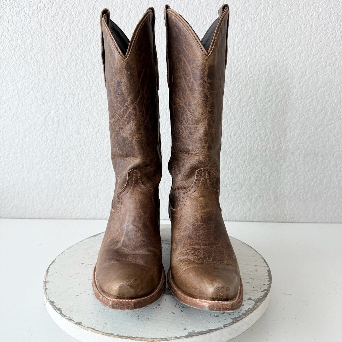 Condition: These are pre-owned boots. The leather is designed to take on a distressed appearance. There is a hole on the inside shaft. This is repairable. They will come in a Boot box and fit true to size.