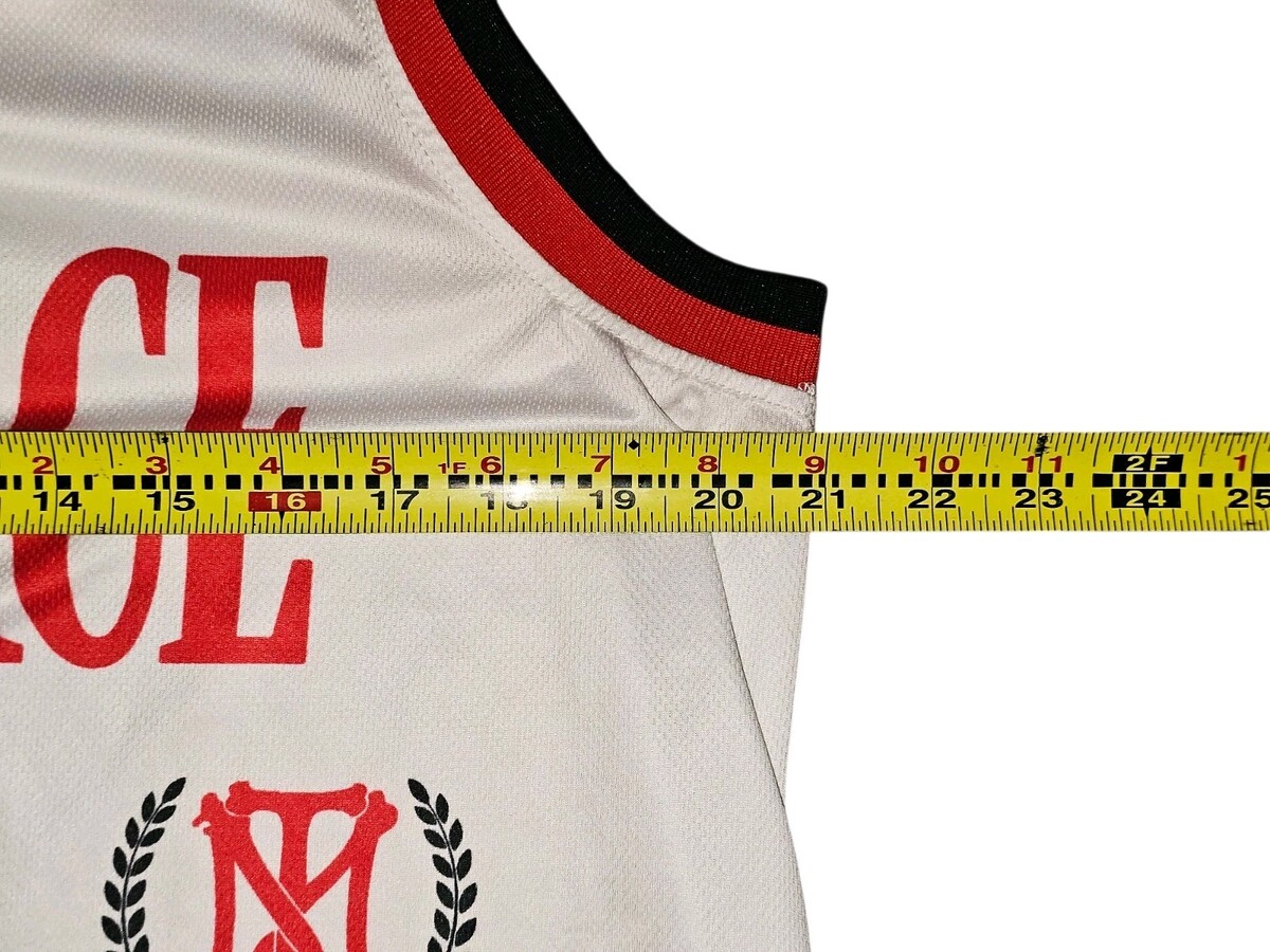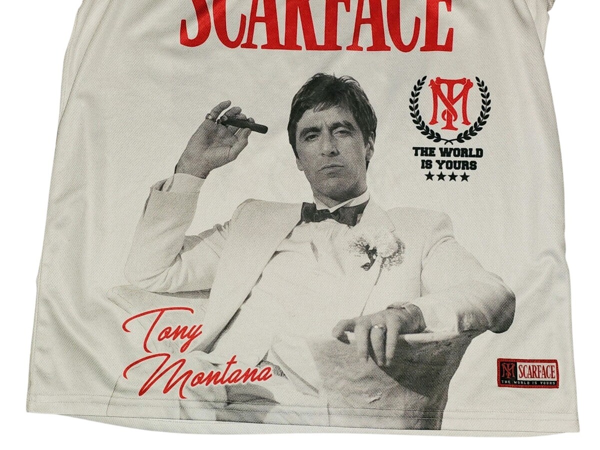 The Scarface Tony Montana "The World Is Yours" White Basketball Jersey is a officially licensed Mad Engine product featuring the iconic character Tony Montana from the movie Scarface. Made for men in a size medium, this NBA-inspired jersey is perfect for fans of basketball and the Scarface team. The white color and China craftsmanship make it a stylish and commemorative piece for any Scarface enthusiast looking to represent their favorite team in the regular season.