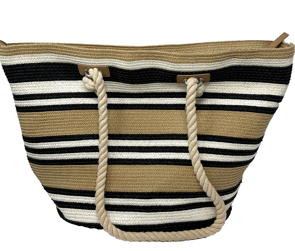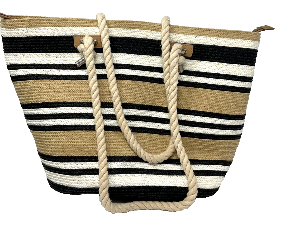 Tan, White, Black Striped Straw Tote Lined Zip Rope Straps 18"W x 12"H x9.5"D