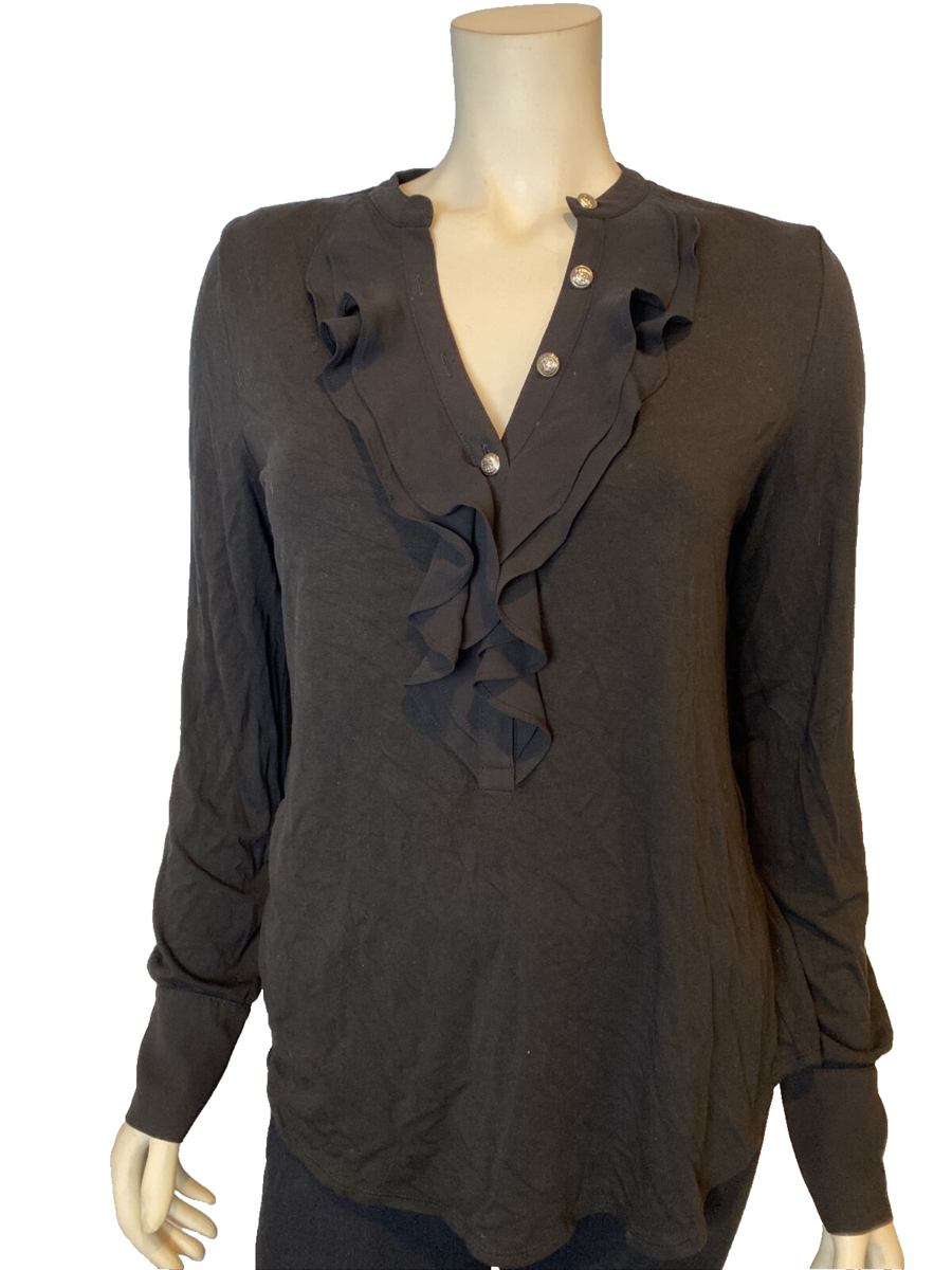 White House Black Market Women's Knit Top with Ruffled Trim Black Medium