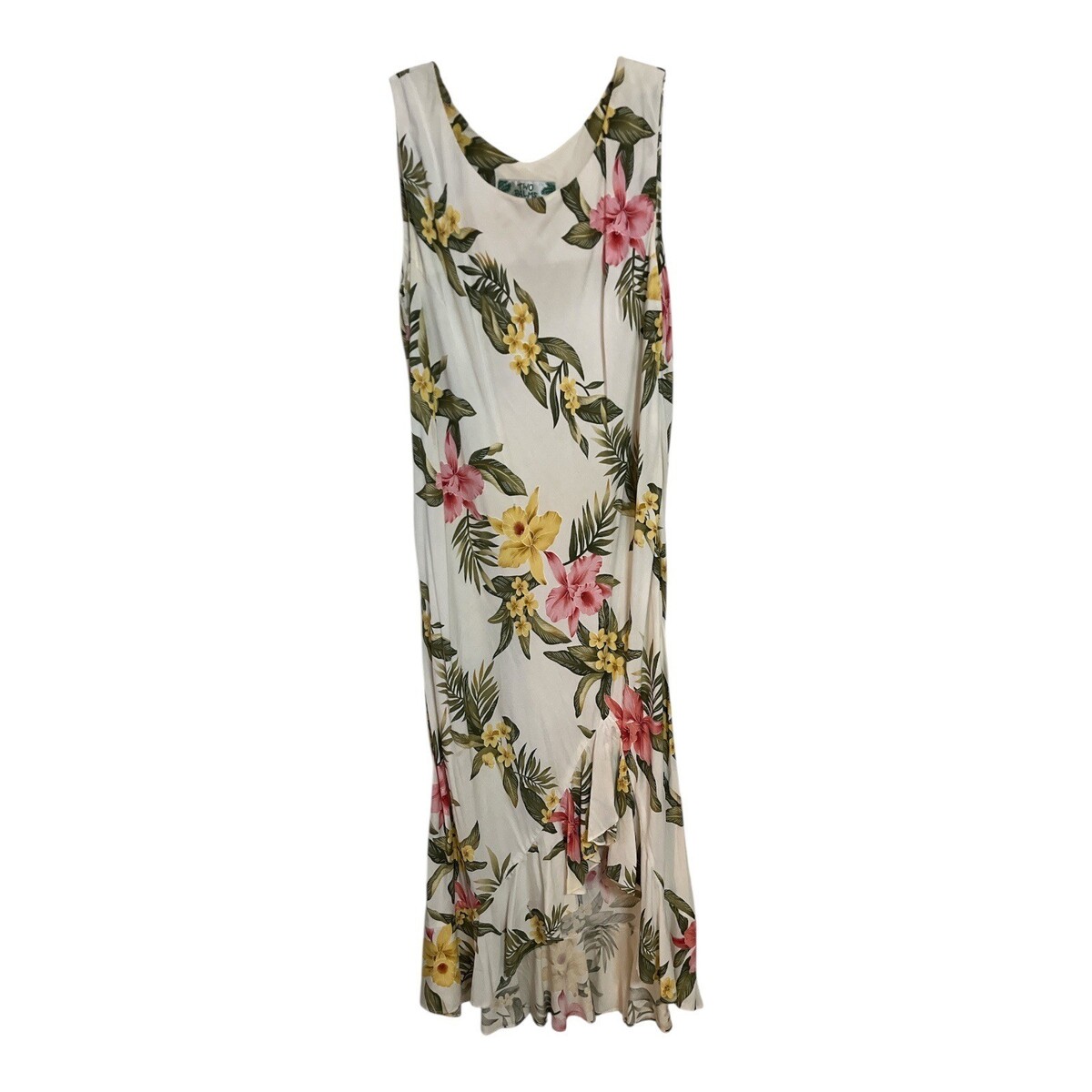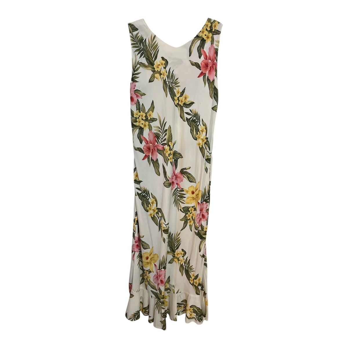 Two Palms Made in Hawaii Floral Rayon Sleeveless Midi Dress White Tropical Print Size M