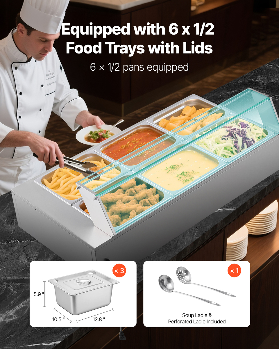 VEVOR Electric Steam Commercial Food Warmer, 1500W, Glass Cover, 6 x 1/2 Size