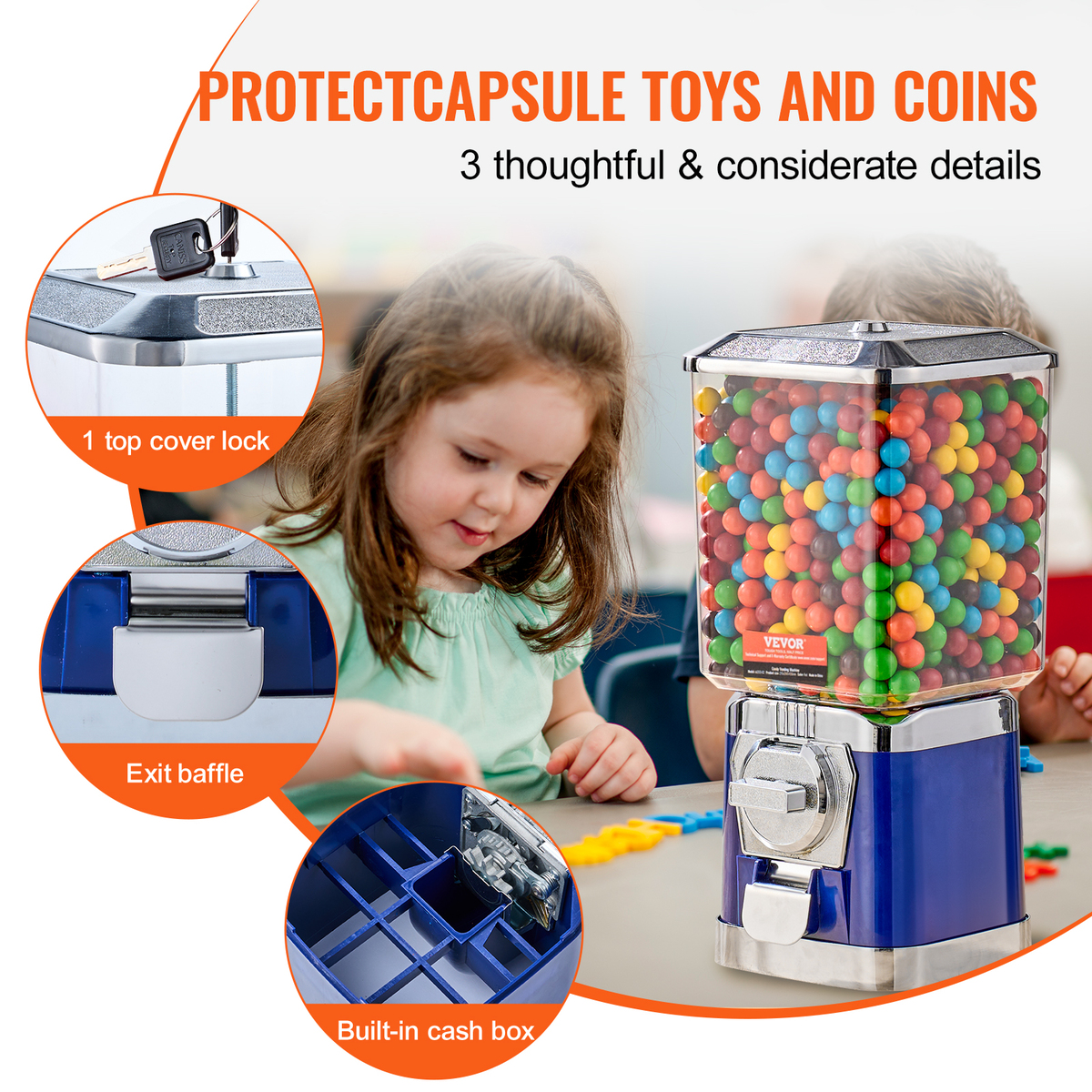 Protecting Candies and Coins: Our gumball machine's top cover is equipped with a lock that can only be opened with our matching key. Therefore, no one can take anything inside without your permission. Additionally, the candy exit is fitted with a metal door guard, cushioning the goods and preventing them from falling onto the ground.