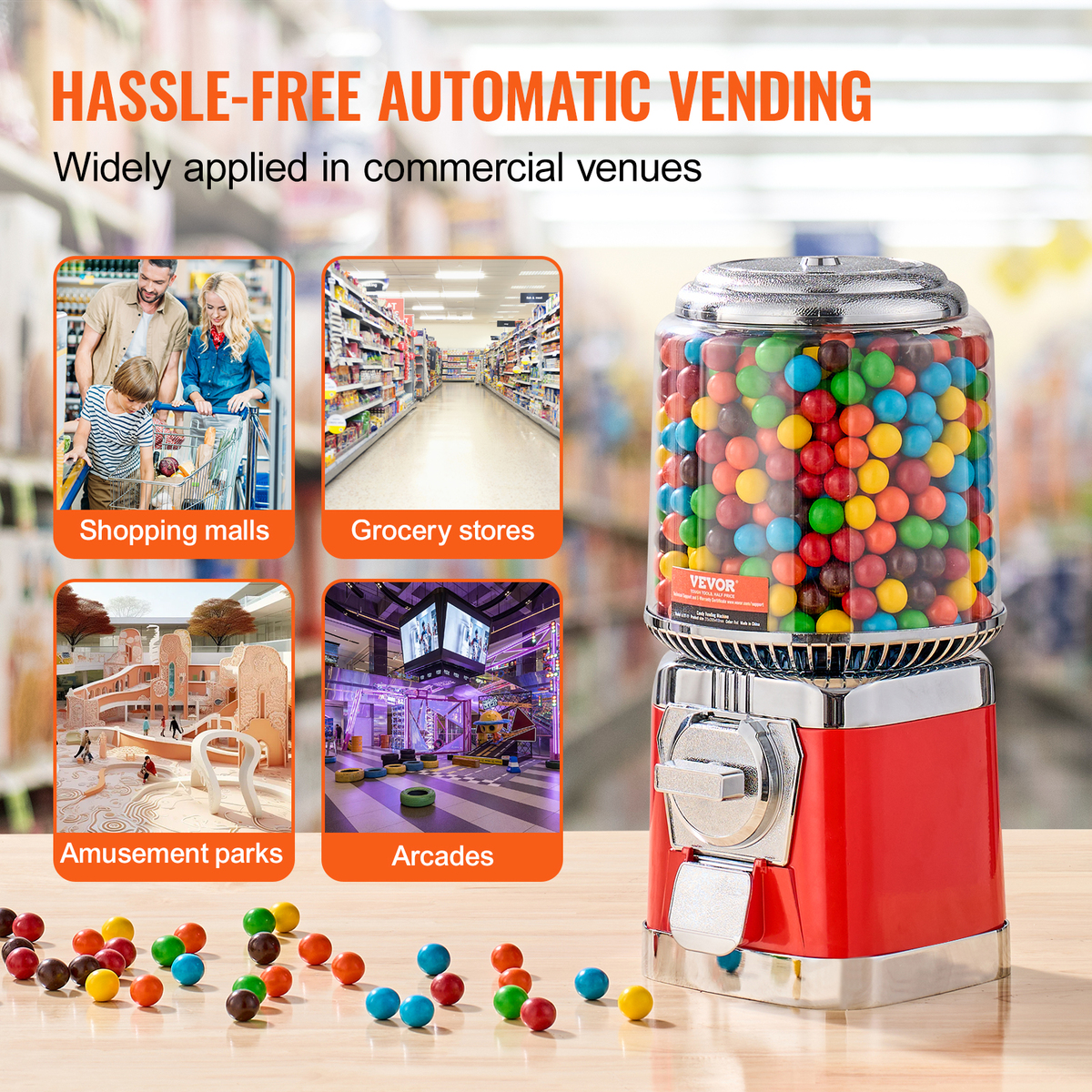 Widely Used in Commercial Settings: The candy dispenser is designed for selling candies, bouncy balls, and mini capsule toys, making it suitable for use in game rooms, restaurants, cafeterias, amusement parks, and malls, providing businesses with more profit opportunities. For those who value spending time with children, you can also place it at home or use it for parties to engage in fun interactions with children.