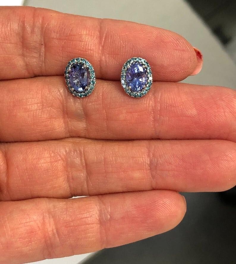 1 quilates Corte ovalado Violeta Azul Tanzanita Pendientes de diamantes de Halo de diamante de 14k Gold White