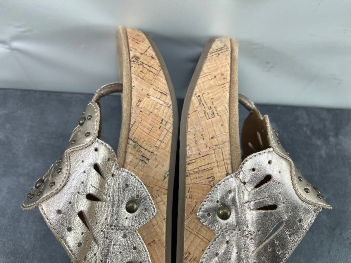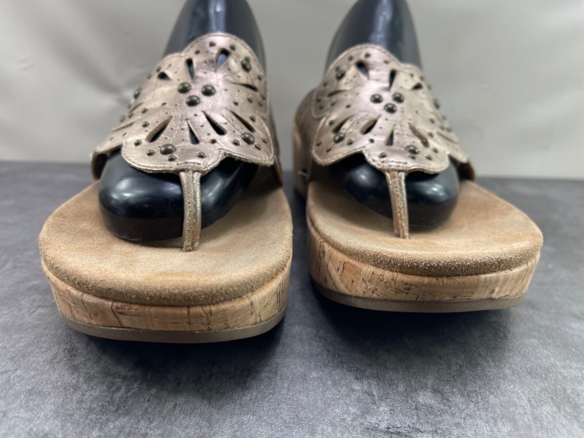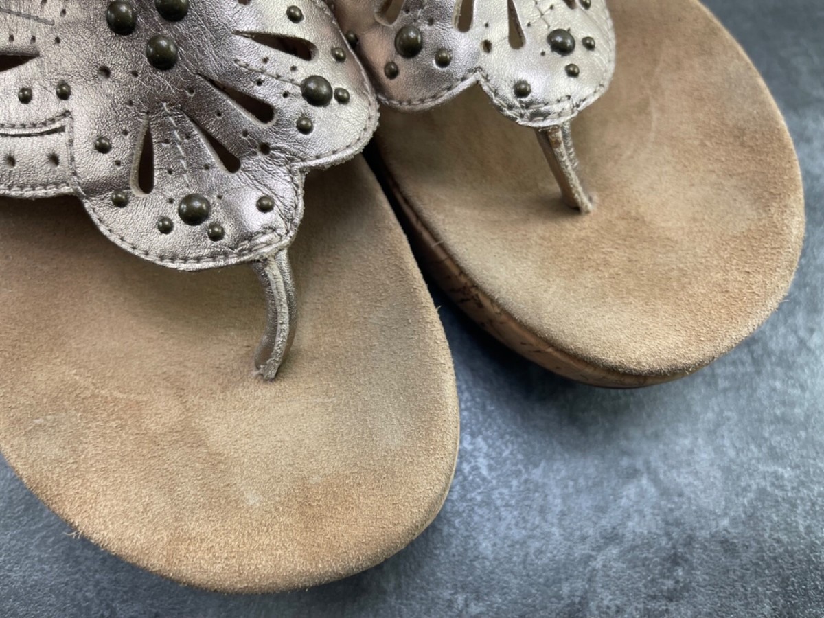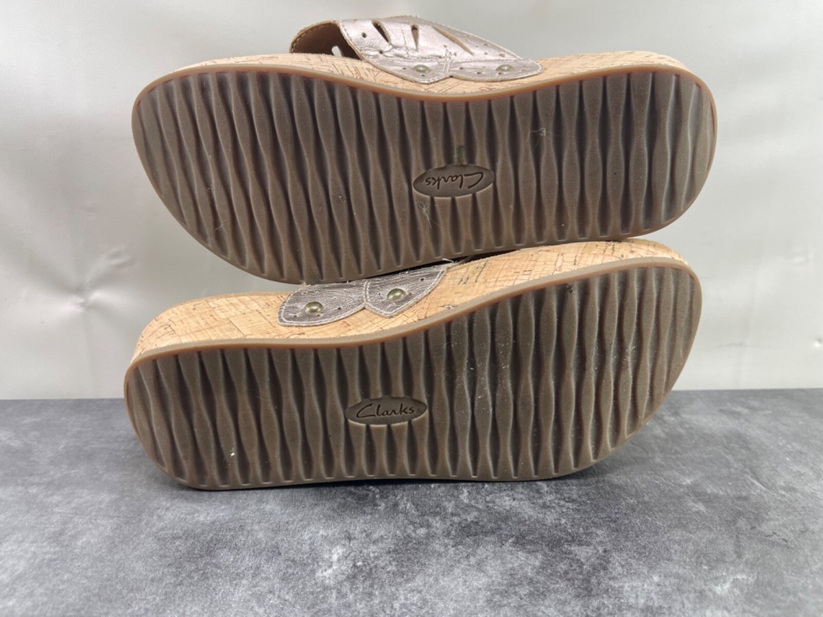 Clarks Artisan Sandals Slides Women 8.5M Emmes Shoes Gold Leather Wedge Thong