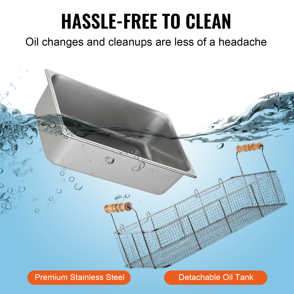 Large Capacity: By utilizing a 12.7Qt/12L oil tank (water capacity: max 18Qt/17L), this commercial electric deep fryer enables you to fry large foods in a large basket, such as 2 whole chickens. It also features 2 removable baskets, allowing you to fry different types of food individually and maintain the unique flavors of each. It works well for delis, concession stands, snack bars, and parties.