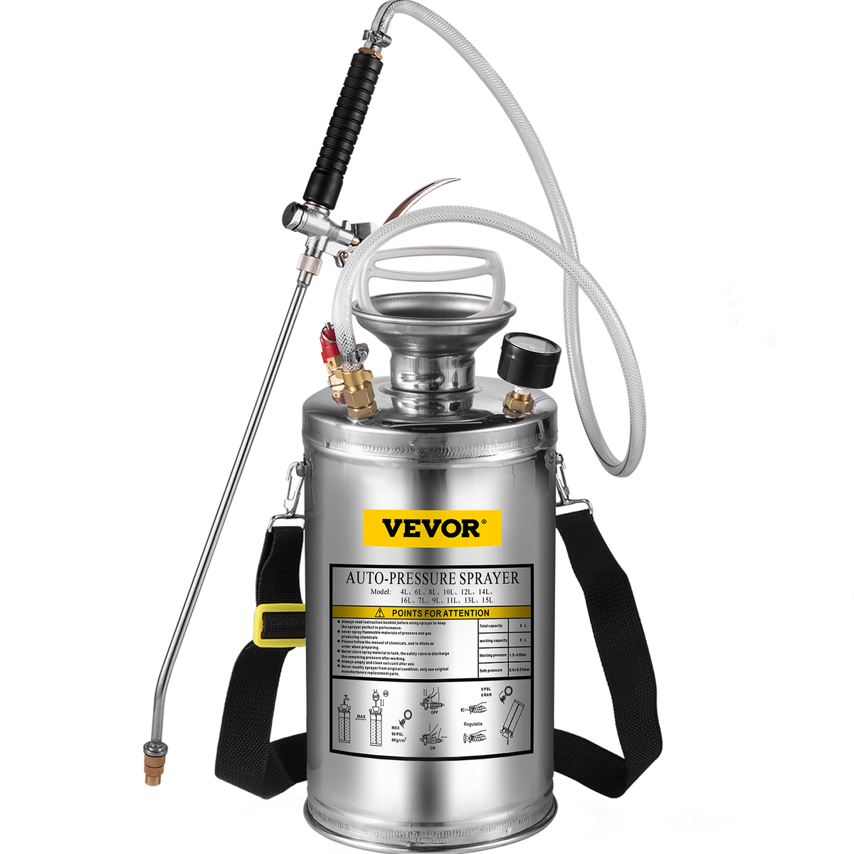 Durable Stainless Steel: Capacity: 1.5 Gal; Pressure: 1.5-4.0 Bar. This hand pump sprayer is made of stainless steel, rust-proof and durable. Pay attention that the rubber ring and internal design are not suitable for strong corrosive, acidic, and base solutions.