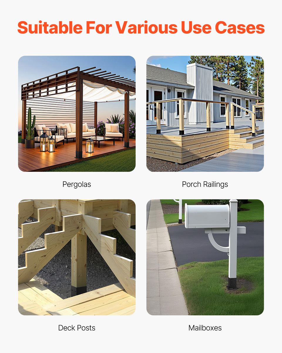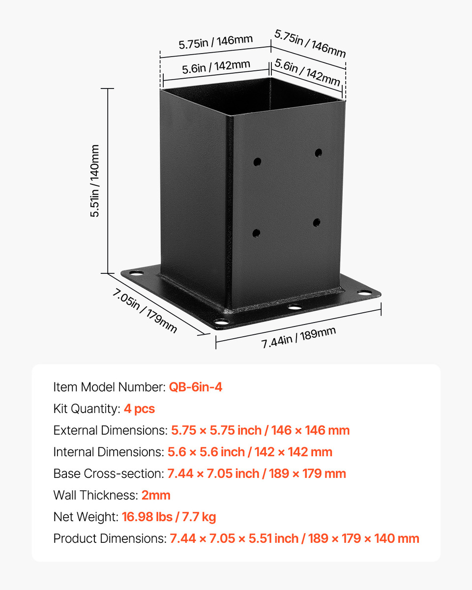 Stable Support: Each post base measures 5.75 x 5.75 inch, with a total of 4 pieces. The inner tube size is 5.6 x 5.6 inch, and the bottom cross-section size is 7.44 x 7.05 inch. It is recommended for use with 5.5 x 5.5 inch posts. The fully enclosed design provides secure, effective support and ensures no wobbling during use