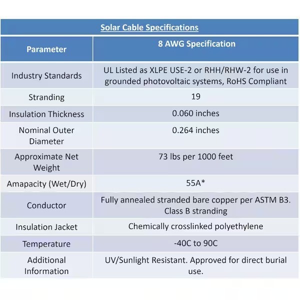 Includes 30 ft. black and 30. ft. red 8-Gauge solar cable