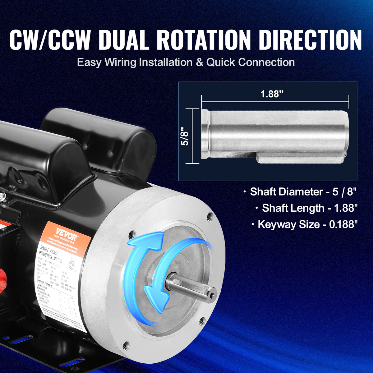 VEVOR 1.5HP Electric Motor 1725 rpm, AC 115V/230V, 56C Frame, 5/8" Keyed Shaft