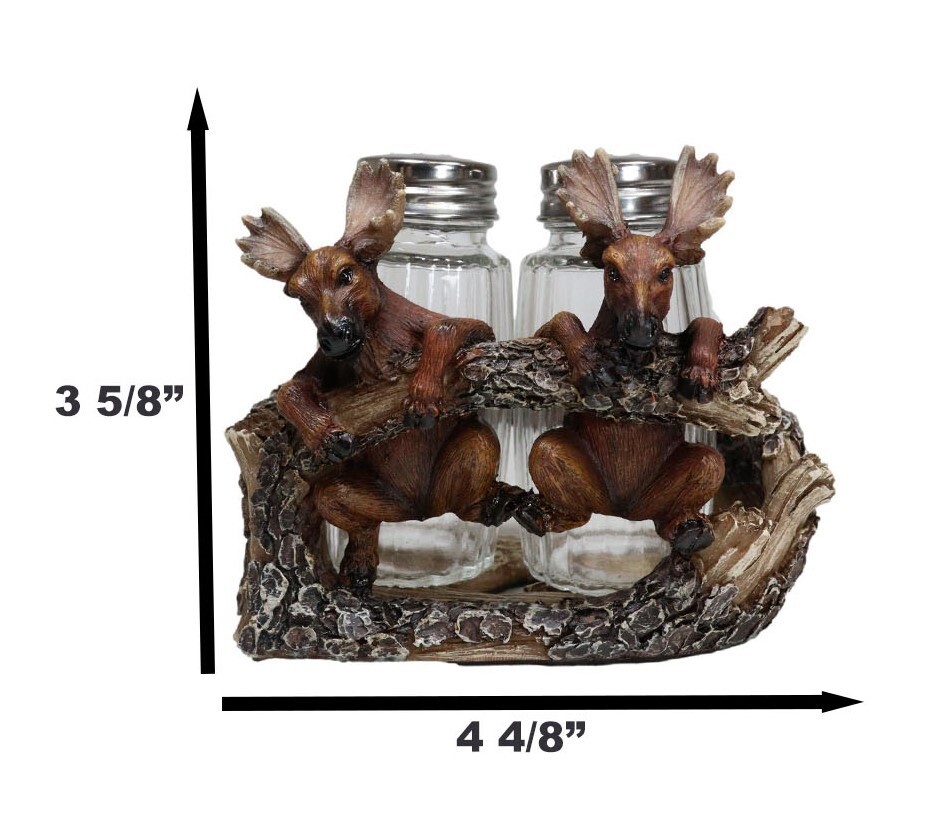 ? This 2 Elk Moose Danging On Tree Branch Salt Pepper Shakers Holder figurine measures 3.5" tall, 4.5" long and 3.5" deep approximately. It weighs about 12 ounces.