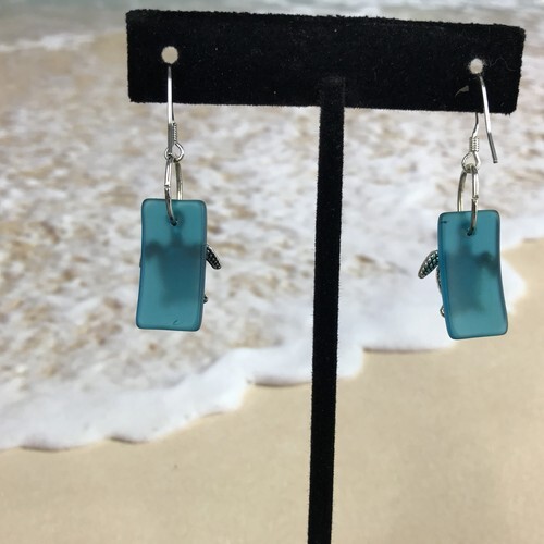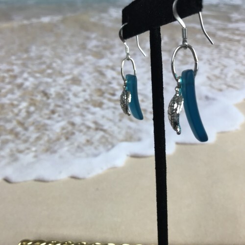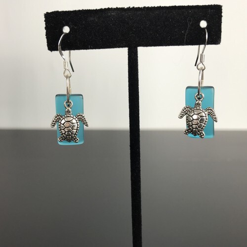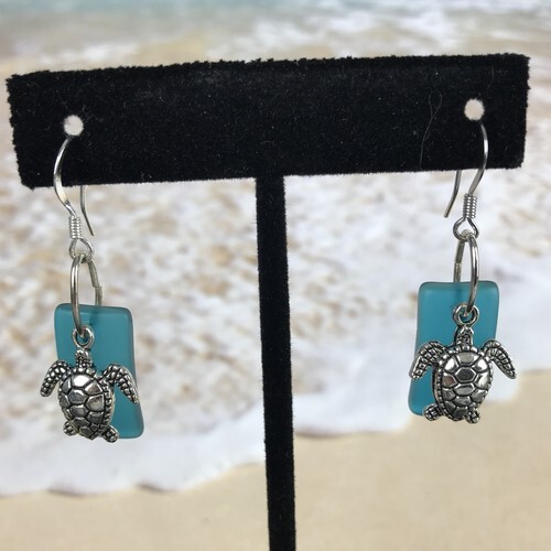 This is a really a cute pair of hand made earrings by me drop tumbled pebble sea glass style and a sea Turtle and with surgical steel ear wires with a 1 1/4" drop. They come to you with a organza gift bag. A beautiful gift to yourself or a loved one!