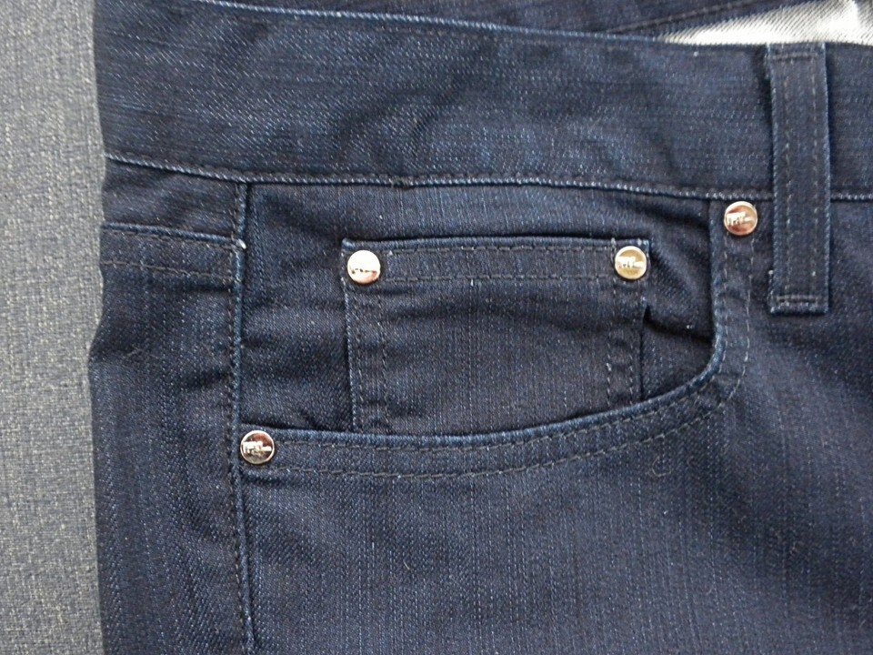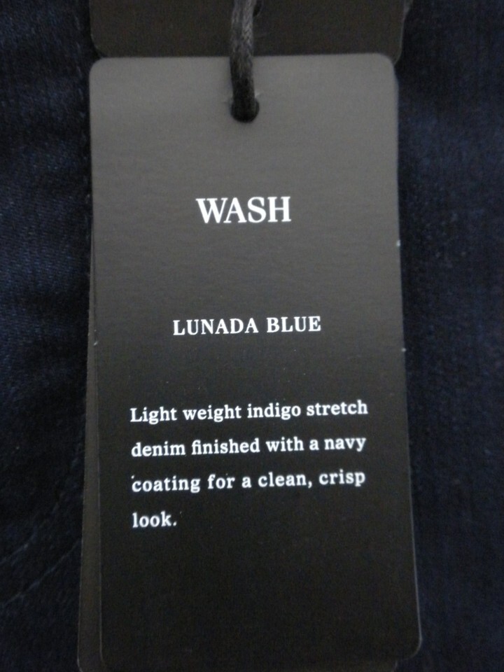 Made in the USA of 98% cotton, 2% elastane. These Black Label jeans are designed for a slim modern fit to sit low on the waist, fit slim through the hip and thigh and skinny straight to the ankle. The color is "Lunada Blue", a lightweight indigo stretch denim finished with a navy coating for a clean, crisp look. Nice enough for dress-up; designed to be casual and comfortable.