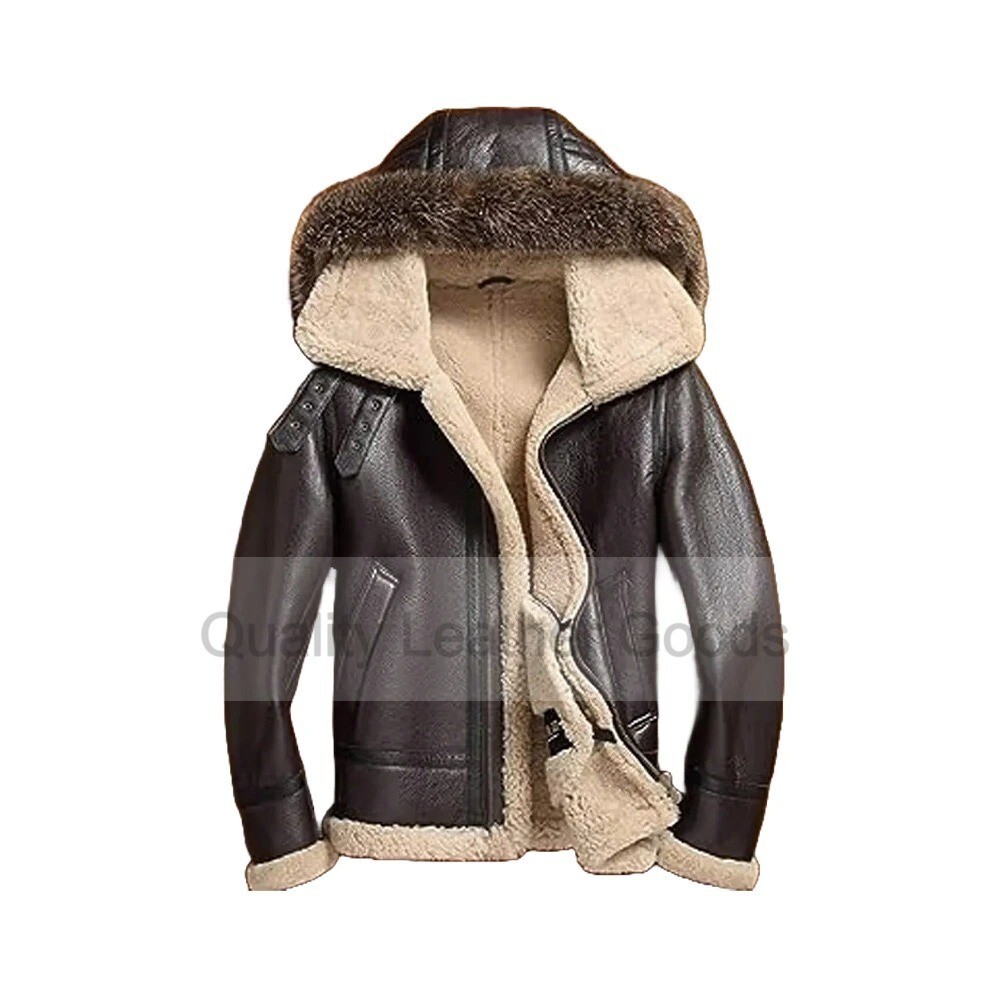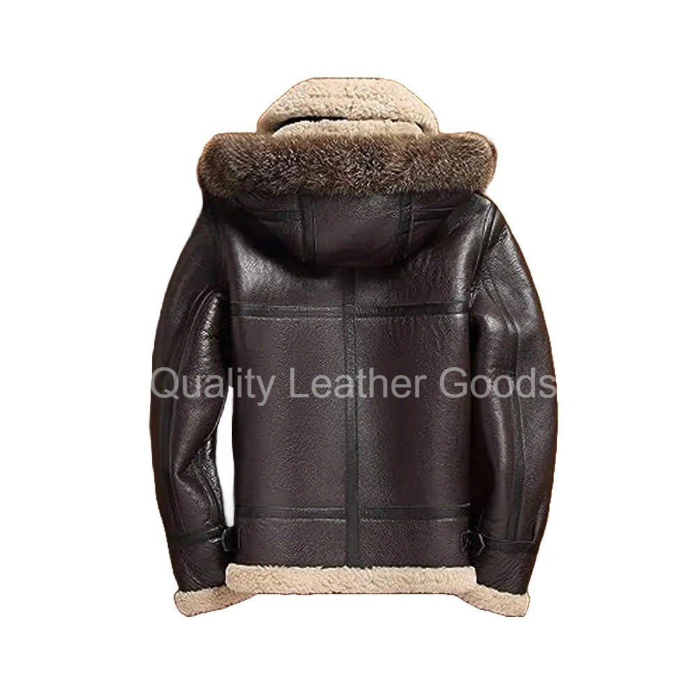 Mens Genuine Brown Leather leder Jacket Vintage Retro Hood with Fur