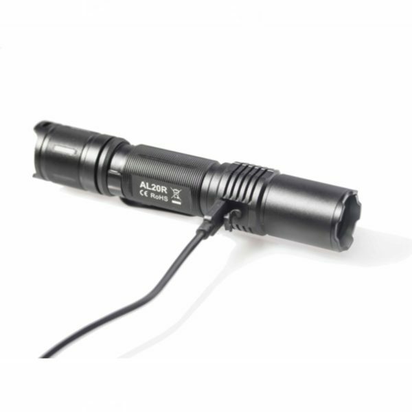 The AL20R is a rechargeable, compact, tri-output strobe and SOS flashlight with a stunning 1180 lumens maximum output. The light has an external Micro-USB port that can be used for charging the unit itself, or for turning the product into a on-the-go power source for other devices such as smartphones or tablets.There are six separate functions on the light that can be toggled through the side switch: High Output, Medium Output, Low Output, Ultra Low Output, Quick Strobe and S O S.Comes with a removable belt clip, a micro-USB cable, USB OTG kit, a lanyard, holster, spare waterproof ring, and a rechargeable 18650 Li-ion battery that can be recharged with a standard micro-USB cable.A perfect everyday carry that is ideal for travelling, camping, running, hunting, water sports, boating and more. Battery Source: One (1) Micro-USB Rechargeable 18650 Li-ion Battery (Included)Lumens: 1180Intensity: 18600cdVisibility Range: 245m (Max)Impact Resistance: 2mWaterproof Rating: IPX-8Length: 5.67" (14cm)Diameter: 1" (2.54cm)Weight: 3.3oz (94.4g) ? Without Battery