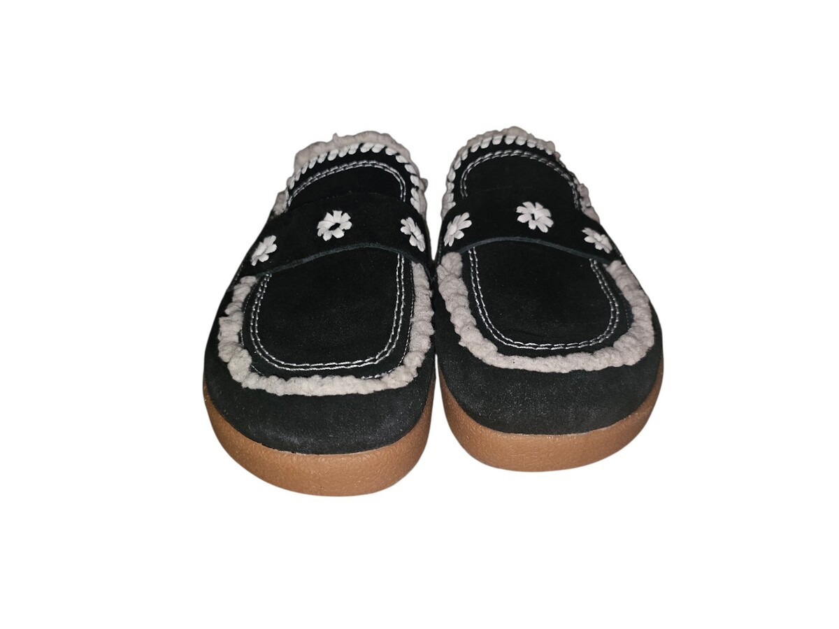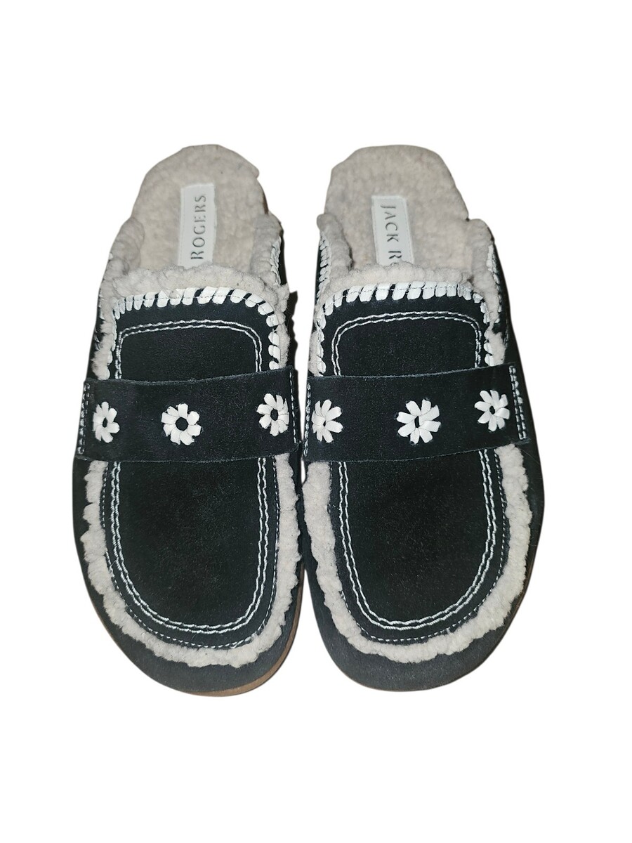 The Jack Rogers Lainey Clog in Black/ Bone Suede/ Nappa is a stylish and comfortable slip-on shoe designed for women in size 10M. This clog features a round toe, flat heel, and cushioned insole for all-day comfort. The black and bone suede/nappa upper with embroidered accents adds a touch of sophistication, making it suitable for casual occasions during the fall and winter seasons. The durable rubber outsole ensures stability and traction, while the faux fur lining provides warmth and coziness. Perfect for those looking for a versatile and classic shoe with a bohemian or beachy vibe.
