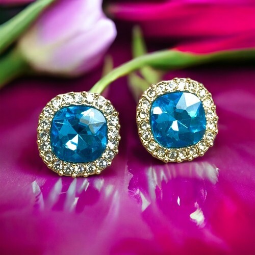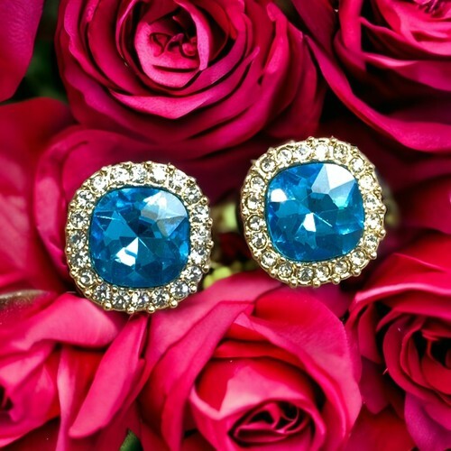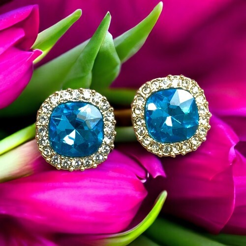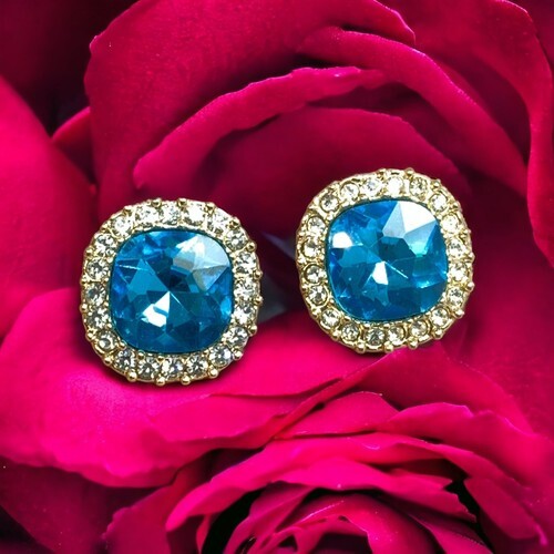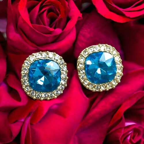 Vintage Large Blue Rhinestone Gold Tone Pierced Earrings.