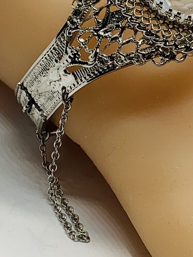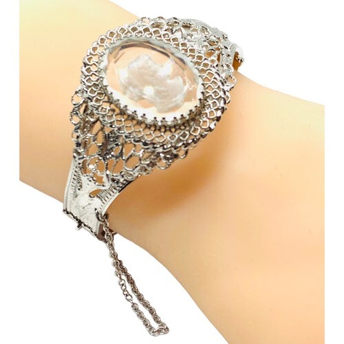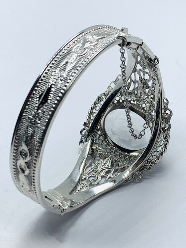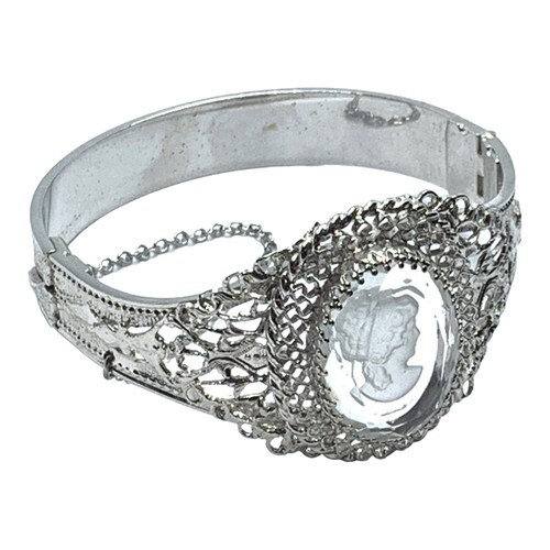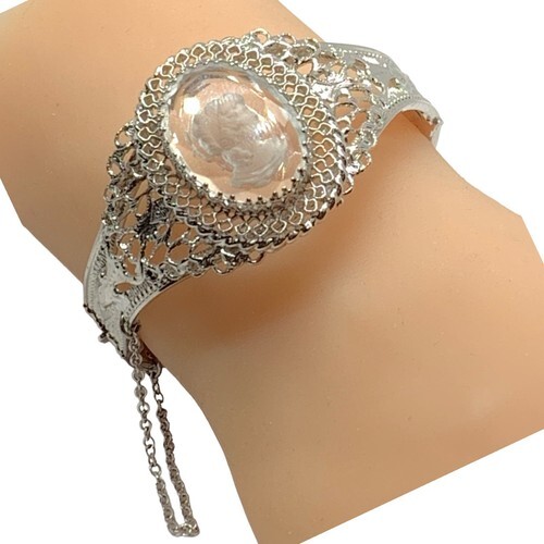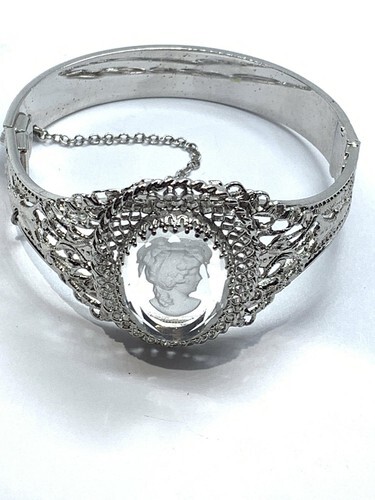 VINTAGE WHITING & DAVIS REVERSE CARVED GLASS CAMEO HINGED BANGLE BRACELET 7.5”