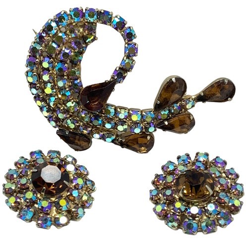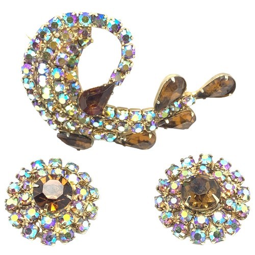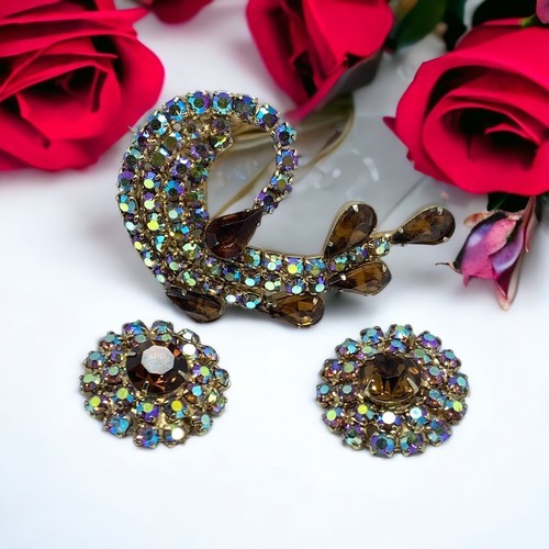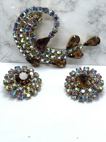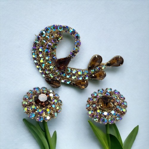 Vintage Quartz AB Rhinestones Brooch Clip On Earrings.