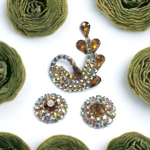 Vintage Quartz & AB Rhinestones Brooch & Clip On Earrings
