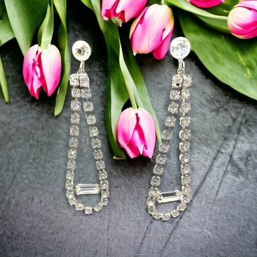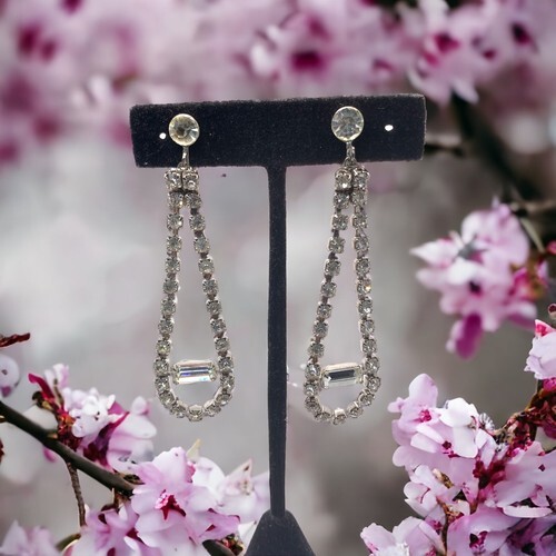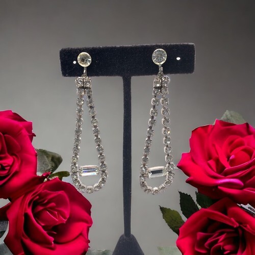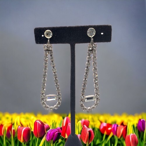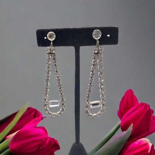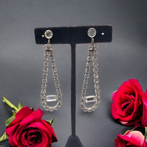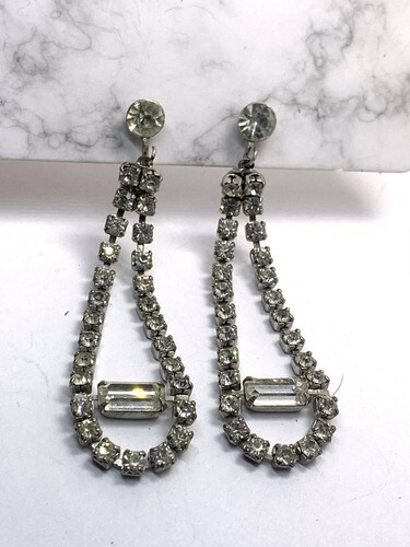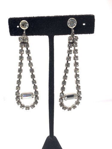 Vintage silver tone Screwback Rhinestone Long Earrings 3” wedding prom