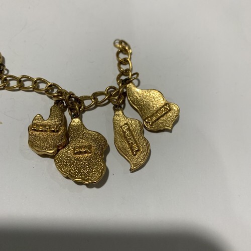 A gold-tone Seven Dwarfs charm bracelet produced by Avon Kids. The charms feature each of the dwarfs from Snow White and the Seven Dwarfs. The bracelet chain measures 6? long and the bracelet is in very good condition with minor wear from age.