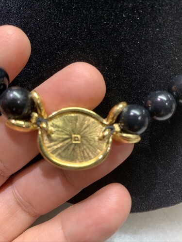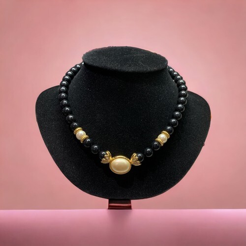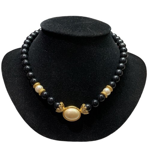 Vintage Avon Faux Pearl Necklace Black Beaded Rhinestones 17”