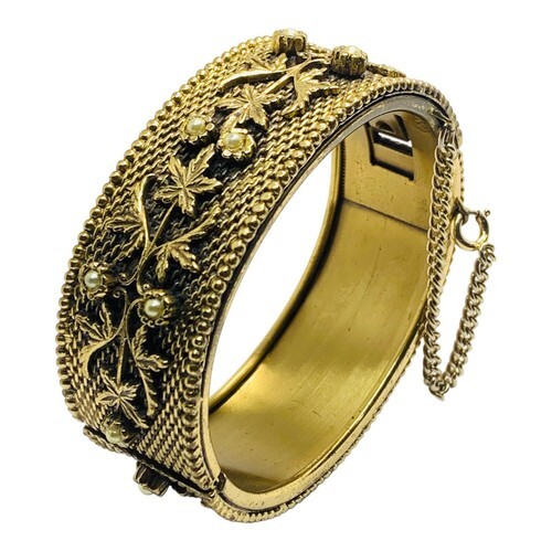 Vintage Heavy Hinged Textured Wide Bracelet w/ Pearl Accents. 93 grams